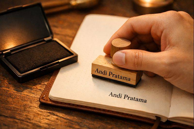 Stempel nama dengan font elegan? Ini baru level dewa. Bisa dipakai di buku koleksi, journal, atau kertas kerja. Terkesan profesional dan aesthetic banget.