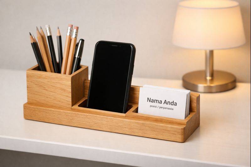 Papan kayu kecil dengan slot untuk hp, pensil, dan kartu nama. Bikin meja kerja langsung rapih dan keliatan profesional. Banyak varian di marketplace dengan finishing natural wood.