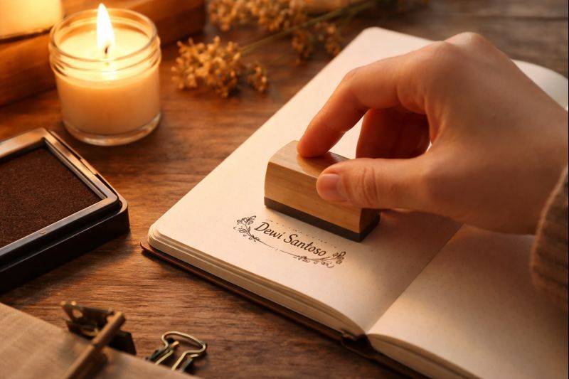 Cari aja di marketplace dengan keyword “stempel nama custom” atau “custom name stamp”. Pilih yang punya review foto nyata. Biasanya terbuat dari kayu dengan ukiran laser, jadi keliatan artisanal. Tambah ink pad warna vintage coklat atau merah bata, total nggak sampai 30 ribu.