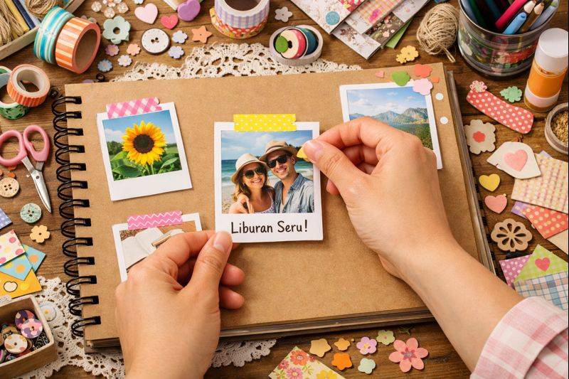 Scrapbook itu bukan cuma album foto, tapi peta perjalanan hubungan kalian. Setiap halaman punya ruang buat cerita panjang, inside joke, dan memorabilia kecil seperti tiket bioskop atau struk kopi pertama kali nongkrong.